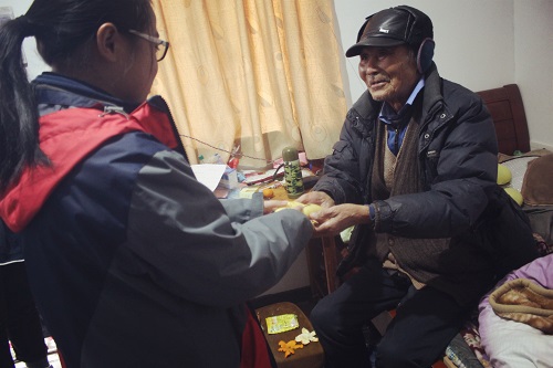到达敬老院时,老人们都热情欢迎同学们的到来。同学们有的与爷爷奶奶风趣地聊着家常,有的给爷爷奶奶捶背。同学们拿出自己准备的爱心礼物送到老人们手上。期间,老人们高兴得合不拢嘴,整个敬老院到处都洋溢着温馨、祥和的气氛。在本次活动即将结束时,同学们与老人们合影留念。